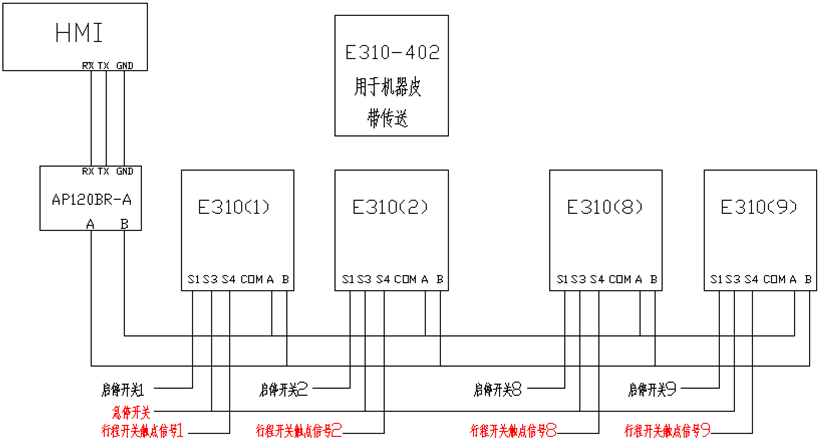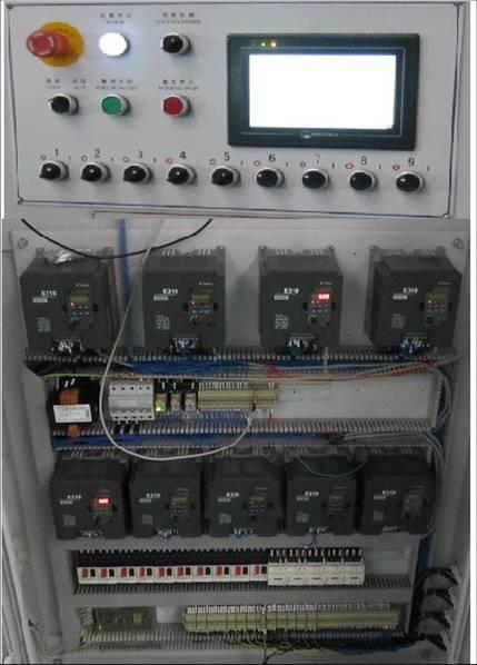 系統(tǒng)組成:臺(tái)安AH系列觸摸屏+AP100系列PLC+E310系列變頻器(1臺(tái)1.5kw,9臺(tái)2.2kw)