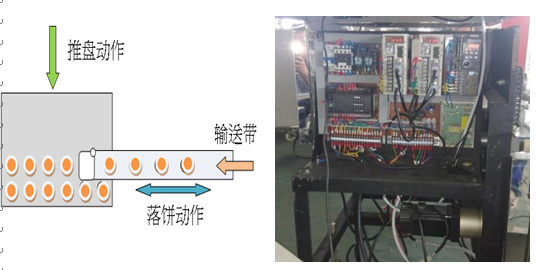 3.落餅循環(huán):整盤落餅完成后,X、Y軸回原點(diǎn),落盤電機(jī)動作,落下新盤,并由Y軸推出,落餅循環(huán)。