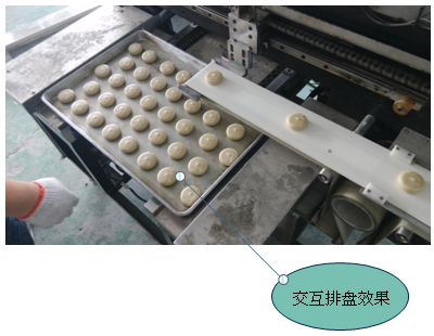 2.推盤動作:落餅完成一行后,X軸回原點(diǎn),Y軸伺服推動托盤一定距離(根據(jù)工藝設(shè)定),第二行落餅開始。